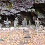 奥の崖は「仏岩」と呼ばれており、昔は仏の姿をした岩があったらしいのですが崩れてしまい、今は崖の下の岩窟に梵天、帝釈天、四天王のうち三体、不動明王の計六体の石像が並んでいます。四天王のうちもう一体があるはずの場所は空席となっています。