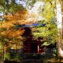 紅葉に埋もれるように建つ楼門です。ここには「女体中宮門」と書した額が掲げられ、両脇には仁王様も安置されていましたが、明治の廃仏毀釈の際に取り払われてしまいました。仁王様のいらっしゃらない楼門はちょっとさびしく映ります。