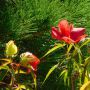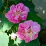 初秋の境内には、ピンクの酔芙蓉と、赤い木槿が咲いていました。