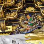 正面の左右の柱には、龍の彫刻が施されており、向かって右側が「昇龍(のぼりりゅう)」、左側が「降龍(くだりりゅう)」となっています。また、この彫刻は柱に直接刻まれたものに黒漆等で着色したものではなく、黒檀に彫った龍を柱に埋め込んだ、贅沢な寄木造となっています。