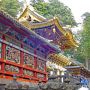 「唐門」(国宝)は「陽明門」と比べると小振りですが、四方向すべてに唐破風がある珍しい「四方破風造」が特徴的です。また「陽明門」ほど原色は使用されておらず、左右の袖塀を含めて白・金・黒を中心にした重みある配色となっています。また彫刻の数は611体あり、「陽明門」の508体を上回っているそうです。