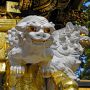 現在、本殿・石の間・拝殿(いずれも国宝)は、修復工事中のためすっきりした写真が撮りにくいのですが、透塀の外から拝殿を撮影してみました。透塀の屋根、拝殿正面の唐破風、唐破風の上の大破風、左右の切妻屋根の稜線等を縁取る金色がハーモニーを奏でるように美しく交わります。