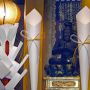 夷堂前では、福娘が二人控えています。手に持つ福笹には「鯛」「大福帳」「蔵」「小判」「当り矢」「福袋」「千両箱」「宝船」「賽」といった縁起物が飾られています。