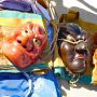 「鎌倉神楽」で使用する太鼓、天狗と山神の面(剣舞毛止幾で被ります)、黒烏帽子、笏です。