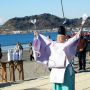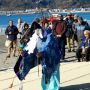 1月11日に催された鎌倉・材木座の漁業に携わる方々のお祭り「汐まつり」において「潮神楽」が執り行われました。晴れ渡った空の下、南正面には相模湾が青々と広がり、稲村ヶ崎の向こうに雪を頂く富士が浮かぶ絶好の舞台で奉納される「鎌倉神楽」には格別の爽やかさがあります。また、普段神社の拝殿内で行われる神事もしっかりと目にすることができ、とても勉強になりました。