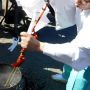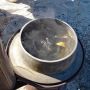 二本の小さな御幣と神楽鈴を手に持ち御神酒瓶子を小脇に抱えたご神職が湯釜に向かい、湯釜の前に二本の御幣を立て、湯釜に御神酒を注ぎます。その後、祭壇に戻り、威儀物、神楽場、湯釜、神具類、参列者を御祓いします。