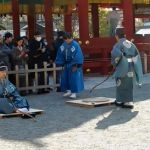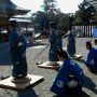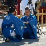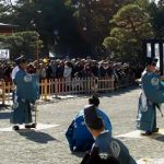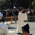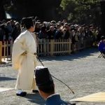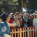 改めて「太郎」「三郎」が「射蓆(いむしろ)」に進み出て「蹲踞(そんきょ)」します。いよいよ歩射が始まります。