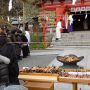 毎年1月25日は、天神様の年の初めの御縁日で、鎌倉・荏柄天神社でも「初天神祭」と、併せて「筆供養」が執り行われます。注連縄を張り巡らした祭場に据えられた銅製の梅鉢には、たくさんの古い筆が積まれており、焚き上げの準備は既に整っていました。神輿庫前の紅梅が鮮やかに咲き始める中、大きく開かれた御本殿の扉の左右には五色の幟をはためかせた大榊が立てられるなど、境内は天神様の御祭礼に相応しい厳かな空気に満たされていました。