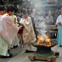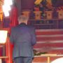 斎主が梅鉢上の古い筆に着火し、持ち寄られた筆を次々と供養していきます。