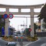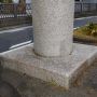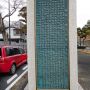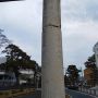 この西柱と若宮大路を挟んで反対側に東柱の跡があります。こちらは歩道の敷石の色を少し変えて 円く敷きつめています(黄色い点字ブロック付)。しかし、もし其々が東西の柱だとすると、この両柱間の幅は、若宮大路をしっかりと跨ぐことになり、現在の石造・一ノ鳥居よりはるかに広くなってしまうのですが・・・。どれだけの高さがあったのか想像を超えます。