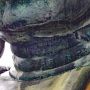 上を見上げると、首の接続部分が見えます。樹脂系の茶色い帯は、昭和三十四年~三十六年(1959年~61年)にかけての耐震補強工事に際して用いられた繊維強化プラスチックです。この時、地震の揺れを吸収するため大仏をステンレス板の上に乗せる耐震構造としました。