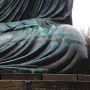 鎌倉大仏は、このように下から順繰りに、複数の層に分けて鋳造していき、最後は小山に埋まったような状態になります。足・胴部が7層、頭部前面が5層、頭部後面が6層になっています。なお、大仏で用いらている青銅は、成分分析の結果、主に中国から輸入した宋銭を鋳つぶしたものであることが判明しています。でも121t・・・ものすごい量ですね。