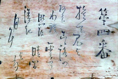 こちらも読みにくいですが、同じご詠歌です。一行目を読んだ後二行目下段を進み、「阿良わ禮(あらわれ) 」以下が二行目上段から続きます。