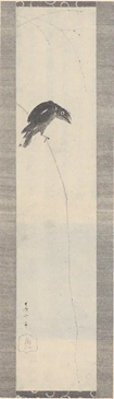 不安定な柳の枝にとまる烏を描いた「紙本水墨柳と烏図」も同じく長沢芦雪の作品です。寒山拾得図と同じタイミングで描かれた小品で和歌山県指定文化財となっています。