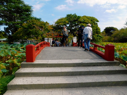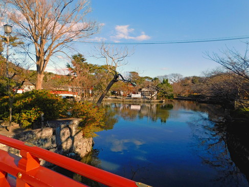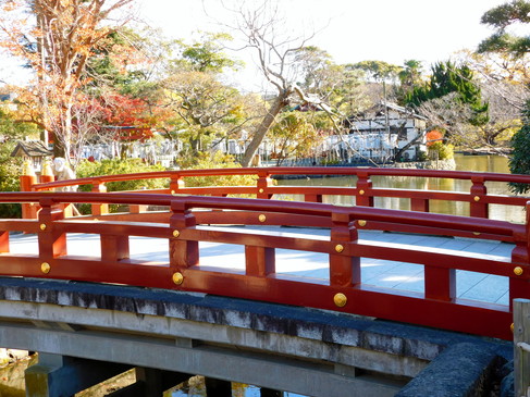 寿永元年(1182年)に大庭景義によって造成された源氏池には、三つの小島がありますが、そのうち太鼓橋寄りの小島に旗上弁財天があります。この小島には、この赤い小橋で渡ることができます。