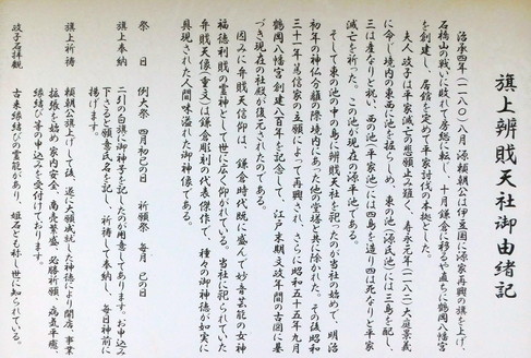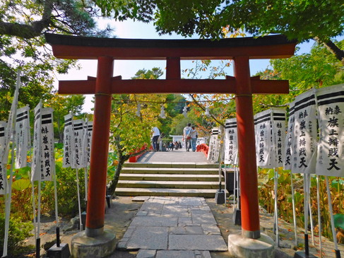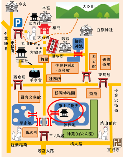 旗上弁財天社は、鶴岡八幡宮の三ノ鳥居をくぐり、太鼓橋横の赤橋を渡った右手にある源氏池の小島にある神社で、周囲に源氏の白旗が立ち並びます。現在の御祭神は市杵島姫命ですが、かつてのご祭神は弁財天で、 12世紀末の鶴岡八幡宮の創建に伴い、若宮大路を下った一ノ鳥居の手前西側にある琵琶小路より、現在の場所に遷座されました。この元々の弁財天は、明治の神仏分離令により、他の末社とともに廃されましたが、昭和31年( 1956年 )に「旗上弁財天社」と名付けられ再建されました。