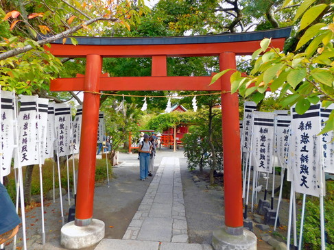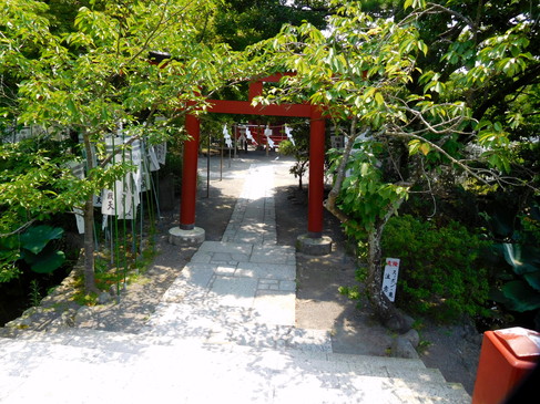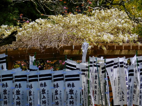 赤い橋から、途中藤棚を潜り、石畳が本殿まで続きます。