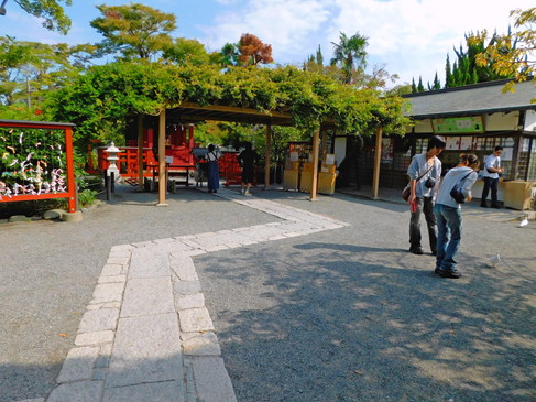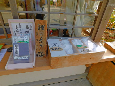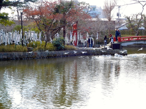 社務所では、鯉のエサが買えます。こちらは鳩のエサにもなりますので、ここに人が立つと、すぐに白鳩が寄ってきます。