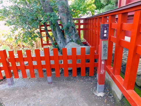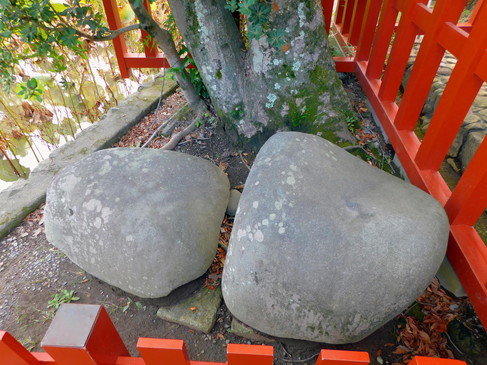 こちらの陰陽石は、北条政子が源頼家を懐妊した際に源頼朝が安産を祈念したことから、授け・安産のご利益があるといわれる政子石(姫石)です。もともとは、本宮前庭にあったものですが、明治期に白旗神社前に下され、さらに旗上弁財天が再建された際に、こちらに移されたものです。