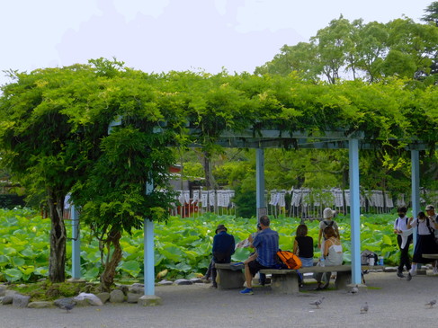 鶴岡幼稚園園庭前の藤棚を通して見た源氏池と旗上弁財天です。