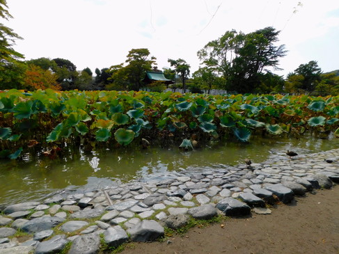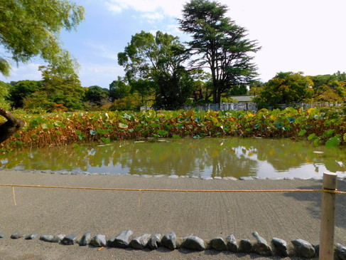 蓮の葉が黄色く変わり、次第に平らな水面が見えてきます。