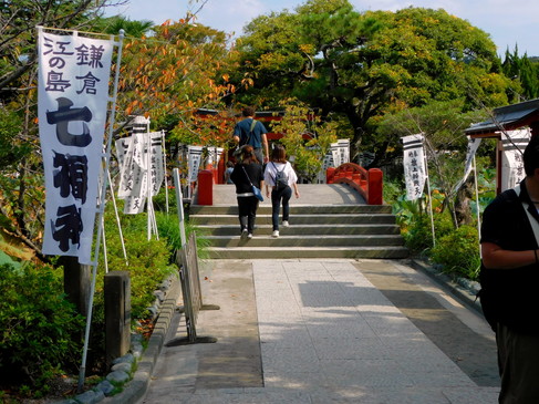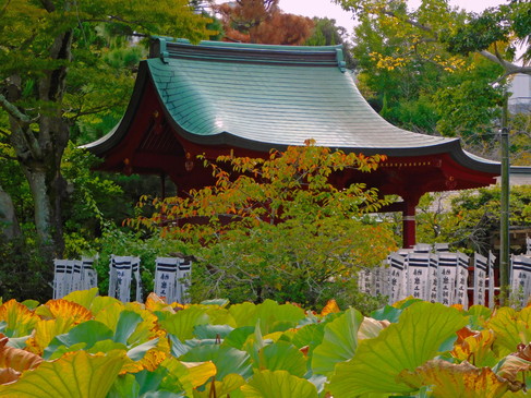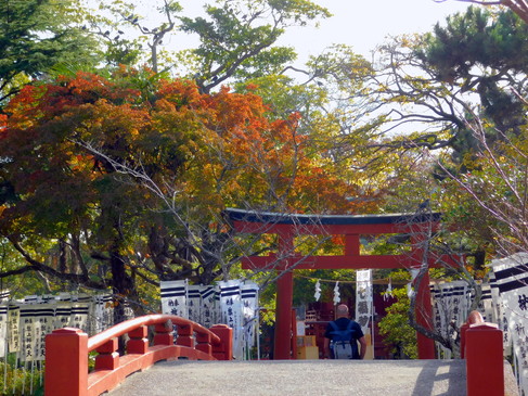 温暖な鎌倉の紅葉は12月にピークを迎え、旗上弁財天社付近も赤く色づきます。