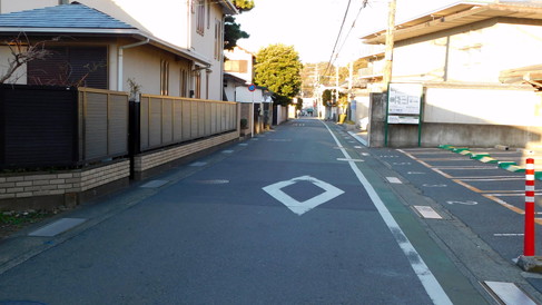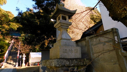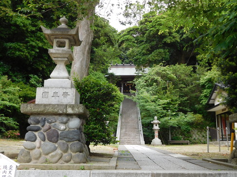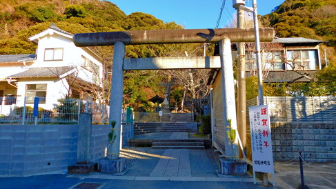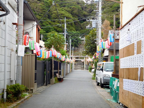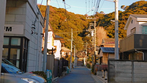こちらが甘縄神明神社の参道で、突き当りに石の鳥居が見えます。