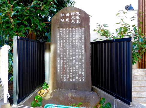 途中の左手に「染屋太郎太夫時忠邸阯」があります。由比の長者とも呼ばれる染屋時忠は、歴史の教科書には出てきませんし、歴史ドラマや映画でもまず目にすることのない人物です。しかし源氏の支配が確立される以前の古い鎌倉世界では、伝説の人として知られ、文武天皇の御世(697~707年)から神亀年中(724~728年)に至る間、この場所に居を構え、東八箇国の総追捕使(そうついぶし)を命じられるほどの武将でした。