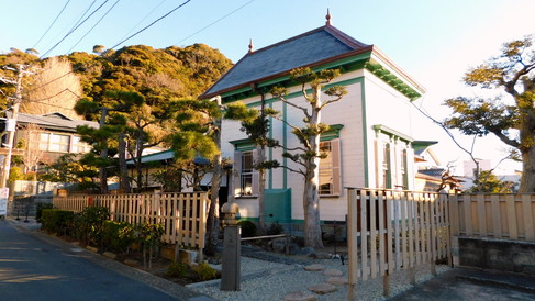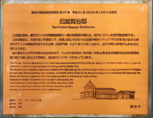 鎌倉には、明治以来の洋風建築が多く残されていますが、旧加賀谷邸もそのひとつで、和洋折衷様式が特徴となっています。洋館部分は、高い天井と大窓という開放的な洋風デザインとなっているのに対し、日本建築の母屋には縁側があり、日本人には馴染み深い空間となっています。大正期に建てられて以降、一時は直木賞作家の山口瞳も住んでいたそうです。