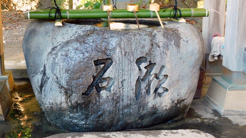 こちらのボリューム感満点の手水石は、昭和12年(1937年)に石材商の原七三郎という方から奉納されたものです。もともとの別当寺甘縄院が臨済宗のお寺だったせいか、禅寺の手水石っぽく「漱石」と彫られています。