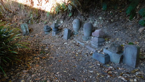 手水舎の裏手に、甘縄神明宮の別当寺であった甘縄院に関係する石碑や石塔がまとめられています。甘縄院は明治20年(1887年)に廃されましたが、それまで染屋時忠の位牌もあったそうです。