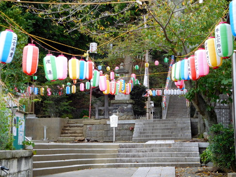 大石段には、カラフルな提灯が掲げられています。大石段下の二基の石灯籠は、昭和29年(1954年)に奉納されたものです。