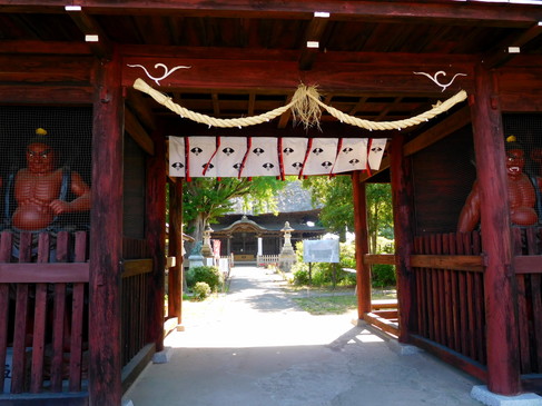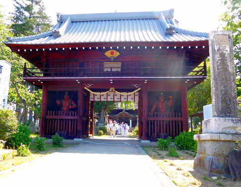 旧仁王門は、宝永五年(1705年)に相模国浦賀の石龍坊が全国より浄財を集めて建立したものですが、昭和15年(1940年)に焼失してしまいました。現在の仁王門は昭和16年(1941年)に再建されたもので、平成23年(2011年)の東日本大震災で受けた被害も平成26年(2014年)に修復されております。正面に掲げられた赤月印に五本骨扇の印は、文治五年(1189年)の藤原泰衝征伐の折、源氏本流以外に使用が禁じられていた無文の白旗を源氏傍流の佐竹隆義が掲げているのを、源頼朝が見とがめて、代わりに与えたものとされています。